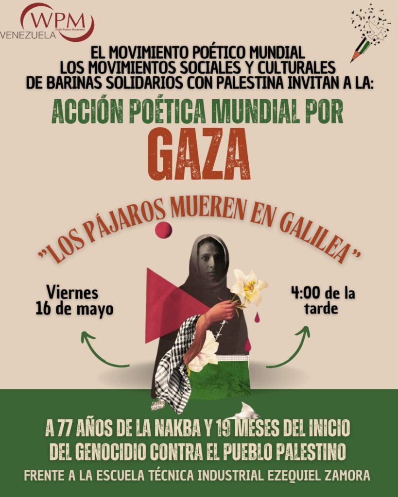 تدعوكم الحركة الشعرية العالمية، بالتعاون مع الحركات الاجتماعية والثقافية في باريناس، فنزويلا، والمتضامنة مع الشعب الفلسطيني، للمشاركة في: