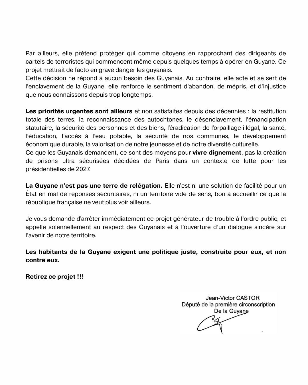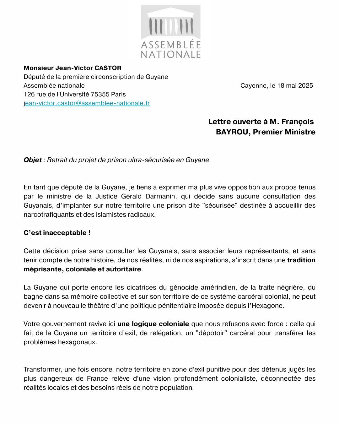 وجه النائب جان-فيكتور كاستور، ممثل الدائرة الأولى في غويانا الفرنسية، رسالة مفتوحة شديدة اللهجة إلى رئيس الوزراء الفرنسي فرانسوا بايرو، بتاريخ 18 مايو 2025، أعلن فيها رفضه القاطع لمشروع بناء سجن “فائق الحراسة” في غويانا، وهو المشروع الذي أعلن عنه وزير العدل جيرالد دارمانان دون أي استشارة أو إشراك للسكان المحليين.