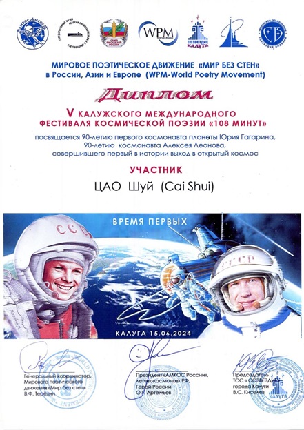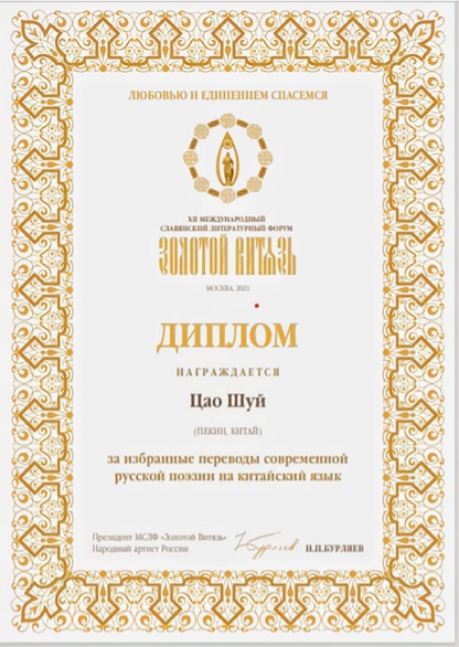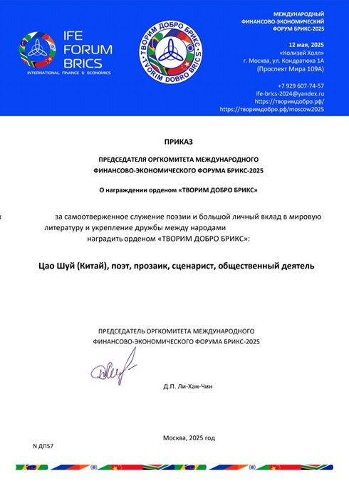 في يوم النصر الروسي، الموافق 9 مايو، بعث فاديم تيريخين، الرئيس المشارك لاتحاد الكتّاب والشعراء الروس، برسالة تهنئة، بمناسبة تكريم الشاعر والكاتب والمسرحي والشخصية العامة الصينية البارزة كاو شُوي بوسام “مُبدع البريكس” (الرقم 57) من قبل لجنة منتدى الاقتصاد والمالية الروسي بمنظمة البريكس، تقديرًا “لخدمته غير الأنانية للشعر، ومساهمته الشخصية الكبيرة في الأدب العالمي، وكذلك لدوره في تعزيز الصداقة بين الشعوب”.