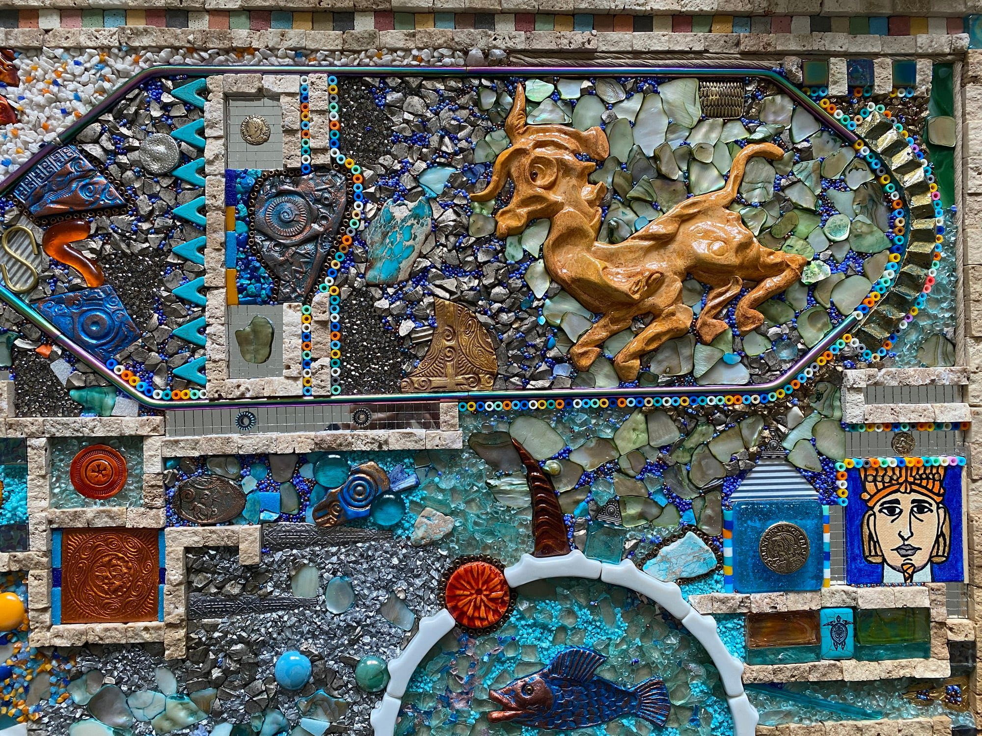 لكن الجميل هو اعتماده في الأساس على فن الموزايك المصري الأصيل. حتى الإطار الخارجي للعمل هو جزء من موزايك تركيب العمل، وهذا طبيعي لفنان مثقف، إنسان، وهذا مهم، ومتابع، وقارئ.