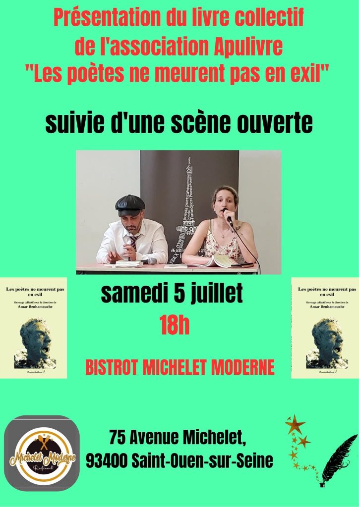 Saint‑Ouen‑sur‑Seine (Paris), 2 July 2025 – This Saturday, 5 July at 6:00 p.m., the literary‑arts association Apulivre will present its latest collective work, Les poètes ne meurent pas en exil (“Poets Do Not Die in Exile”), at the convivial Bistrot Michelet Moderne, 75 Avenue Michelet, 93400 Saint‑Ouen‑sur‑Seine – just north of the Paris city limits. The launch will be followed by an open‑mic stage where poets and musicians of all backgrounds are invited to share their voices. Admission is free; a dinner menu and bar service will be available on site.