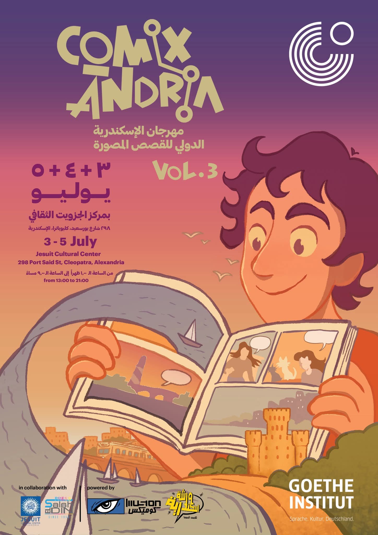 افتتح يوم الخميس 3 يوليو، واحد من أهم الأحداث الفنية ذات الصلة بالفنون البصرية، مهرجان ” كوميكساندرينا: مهرجان إسكندرية الدولى للقصص المصورة “، وهو من تنظيم معهد جوته بالتعاون مع مركز الجيزويت الثقافى، ومطبعة صلاح الدين، وورشة إسكندرية للقصص المصورة، وإليوجن كوميكس، وهذه هى الدورة الثالثة التى يقام فيها المهرجان وتستمر ثلاثة أيام متتالية فى مقر مركز الجيزويت الثقافى.