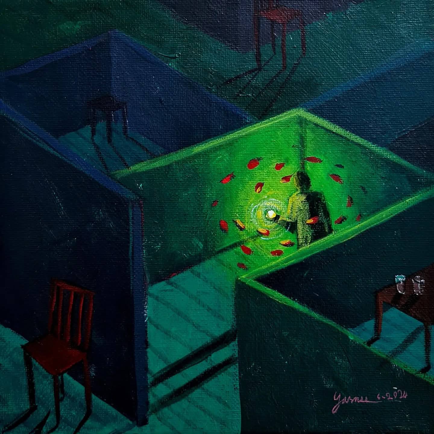 ياسمين ترسم لتُقيم حفلاً صامتاً، حيث كل لون يؤدي دوره بتوتر درامي عالٍ. باليتتها اللونية جريئة ومتمردة؛ ألوان متوهجة حارة تقفز وسط برودة المشهد، تمنحه هالة تشبه الحلم، أو الرؤيا. الضوء هنا شريك أصيل في السرد، وشخصية محورية ضمن النص البصري.
