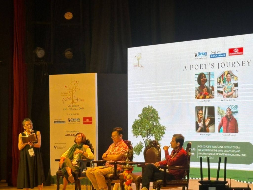 In the session “A Poet’s Journey,” held on August 2, Mamta Sagar was joined by poets Anju Makhija, Daryl Lim Wei Jie from Singapore, and Debasish Lahiri. Together, they shared their personal journeys in poetry—exploring the evolution of their voices, the formative moments that shaped their writing, and the intimate intersections between life and language. The conversation was marked by warmth, depth, and mutual admiration, with each poet offering unique reflections on the role of poetry in navigating identity, history, and imagination.