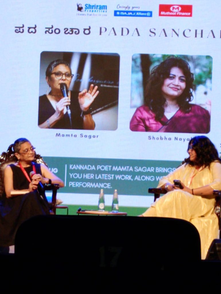 Later that day, Mamta Sagar also led the “Pada Sanchara” session—an immersive Kannada poetry performance that brought her words to life through a multi-disciplinary collaboration. Joined by Shobha Nayak, the Kaavya Sanje ensemble, and artists Chand Pasha N.S., Dadapeer Jyman, Hajeera Khan, and Siddartha M.S., the performance combined spoken word, rhythm, and movement to powerful effect.