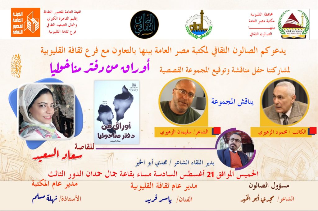 وفي إطار التعاون بين مكتبة مصر العامة ببنها بقيادة الأستاذة نهلة مسلم، مدير عام المكتبة، وتنسيق الأستاذة أماني ناجي والشاعر مجدي أبو الخير، مسؤول الصالون الثقافي بالمكتبة، والهيئة العامة لقصور الثقافة وفرع ثقافة القليوبية بقيادة الفنان ياسر فريد، مدير عام الفرع، والأستاذة غادة محمد، مدير الإدارة الثقافية بالقليوبية، تقام هذه الفعالية السابعة مساء الخميس ٢١ أغسطس بقاعة جمال حمدان بمقر المكتبة بمنطقة الفلل للاحتفاء بثالث إصدارات النشر الإقليمي للمحافظة.