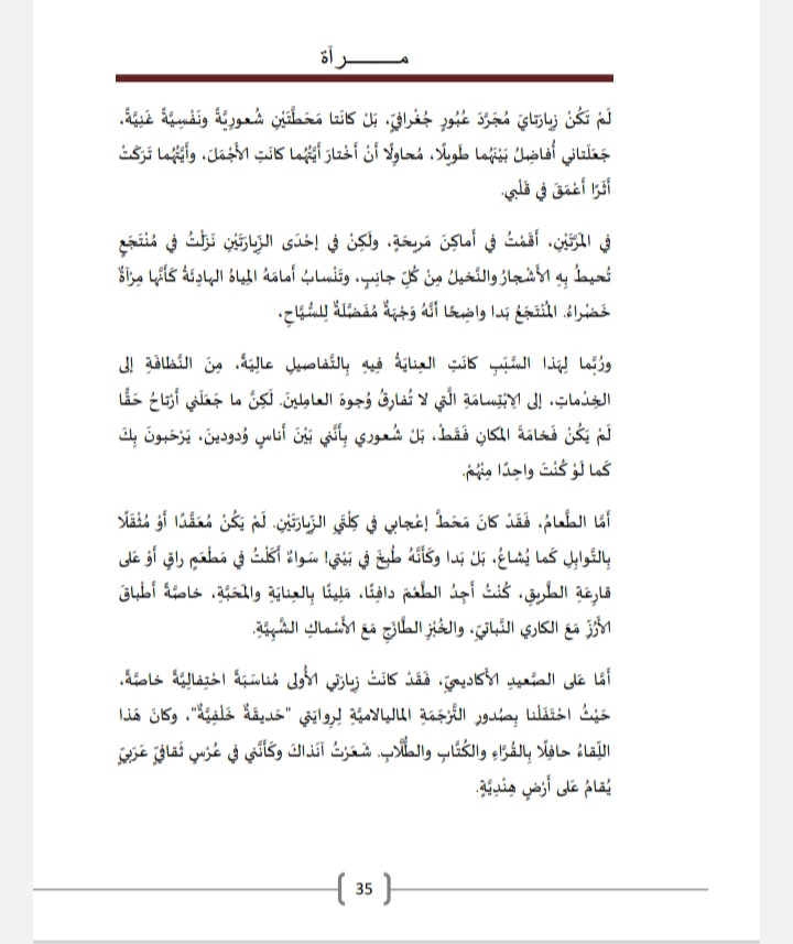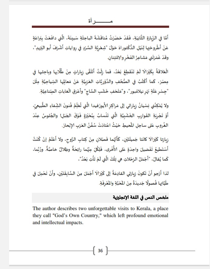 زيارتا كيرالا كانتا جميلتَين، كأنّهما فصلان من كتاب الرّوح، ولا أعلم إن كنت أستطيع تفضيل واحدةٍ على الأخرى، فلكلٍّ منهما رائحةٌ وظلالٌ خاصّة. وربّما، كما يُقال: “أجمل الرّحلات هي تلك التي لم تأتِ بعد”، لذا أَرجو أن تكون زيارتي القادمة إلى كيرالا أجمل من السابقتين، وأن تحمل في طيّاتها فصولًا جديدة من المحبّة والمعرفة.