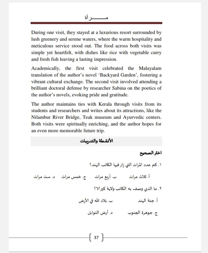 وتتناول الوحدة الثالثة التعبير الشعري، حيث تبرز أبيات من قصيدة “الفتح المبين” للقاضي محمد، وأشعار معاصرة لشعراء مثل شهاب غانم وسالم خالد الرميضي، تعكس جمال كيرالا ومعالمها وروحها وتاريخها.