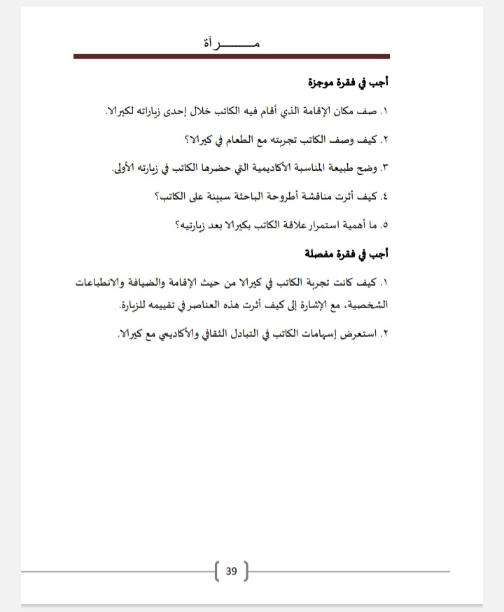 وجاءت مقالة الكاتب المصري مخصَّصةً للدَّرس الأوَّل، متبوعةً بترجمةٍ، وأسئلةٍ معرفيّةٍ وبلاغيّة، وكان عنوانها: (رِحلتاي إلى كيرالا: محبّة لا تنطفئ).