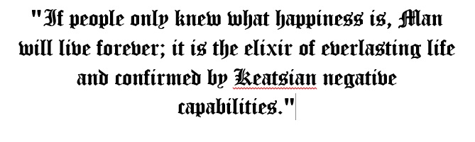The pursuit of happiness is a human longing that has long been a central theme in philosophy, literature, and human existence and endeavor. The abovementioned quote presents a profound reflection on the nature of happiness, its transformative power, and its philosophical implications. Happiness, in this case, is not merely a fleeting emotion but a metaphysical force capable of transcending mortality. The reference to “Keatsian negative capabilities” adds a layer of poetic and philosophical depth, invoking the Romantic poet John Keats’s idea of embracing uncertainty and mystery without the need for concrete answers.