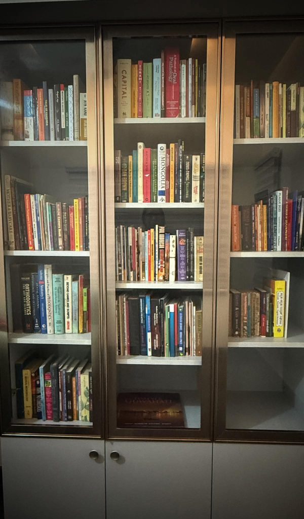 على الأرفف طيف واسع من المراجع الطبية في أمراض الفم، وتقويم الأسنان، وأمراض اللثة، والممارسات الإكلينيكية، ما يدل على التزامها بالتفوق الأكاديمي والإتقان المهني. هذه المراجع تشكّل الأساس العلمي الصلب لمسيرتها الطبية.