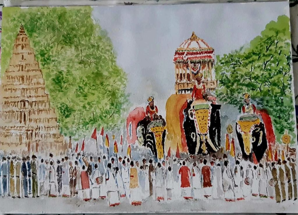 حزينًا على هذا الخبر، رسم والدي هذه اللوحة المائية تكريمًا لأرجونا. سيُفتقد الفيل الملكي في ولاية كارناتاكا من الجميع 😢 — يا راميش نارايان، إنها أفضل أعمالك حتى الآن.»