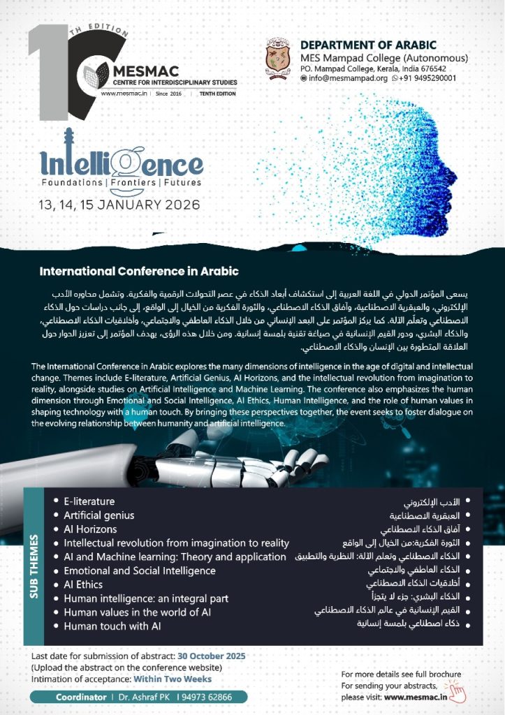 وأعلنت كلية ممباد، التابعة لجامعة كاليكوت – كيرلا، الهند، ممثَّلة في قسم اللغة العربية، عن انعقاد مؤتمر ميسماك الدولي في دورته العاشرة، الذي سيُقام في الفترة من 13 إلى 15 يناير 2025م، بمشاركة نخبة من الأكاديميين والباحثين من مختلف أنحاء العالم العربي والإسلامي.