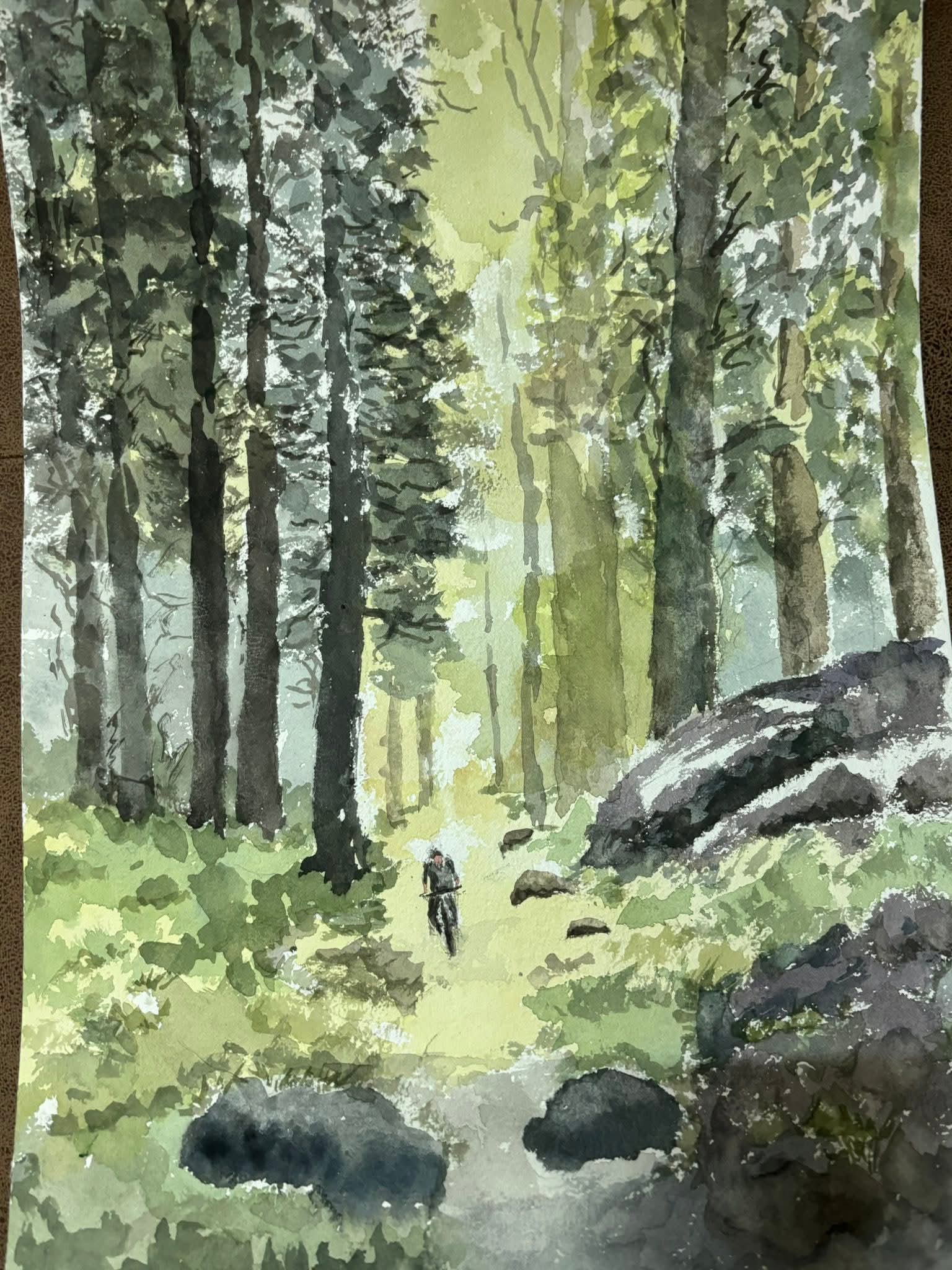 This watercolor composition captures a quiet intersection of nature and human presence — a fleeting yet eternal moment where stillness speaks louder than activity. The artist’s choice of medium, watercolor, is not incidental but essential: its fluidity mirrors the transient beauty of the scene itself, where sunlight filters through a canopy of leaves, dissolving form into atmosphere.