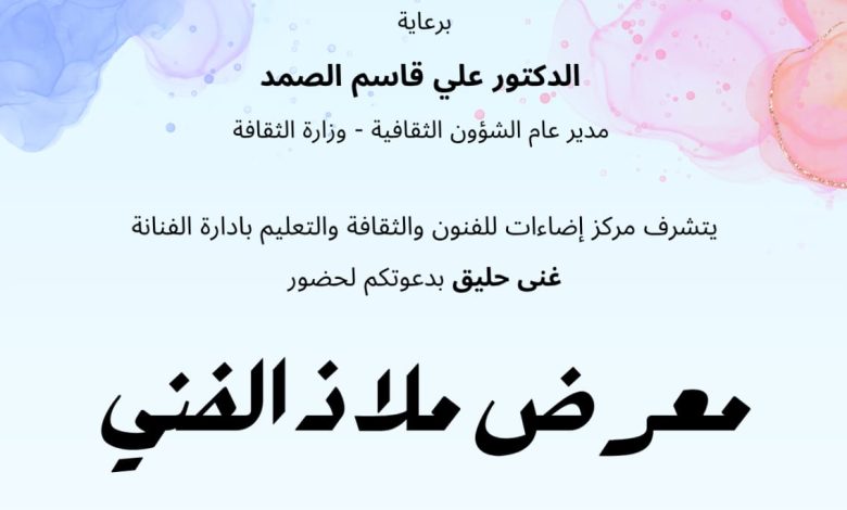 برعاية الدكتور علي قاسم الصمد، مدير عام الشؤون الثقافية في وزارة الثقافة، افتتح في قصر الأونيسكو الثقافي في بيروت مساء الخميس الواقع في 20 تشرين الثاني 2025 معرض «ملاذ» الفني، الذي ينظمه مركز إضاءات للفنون والثقافة والتعليم بإدارة الفنانة غنى حليق.