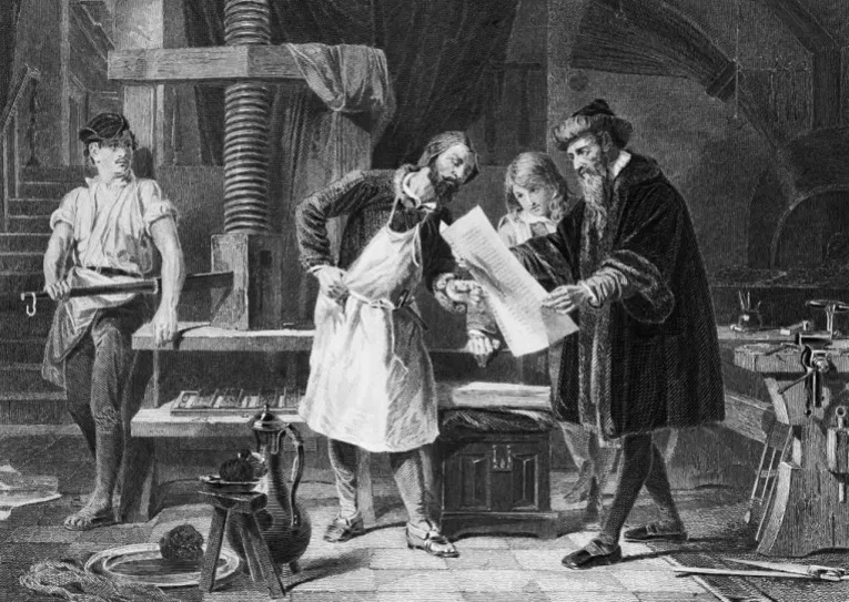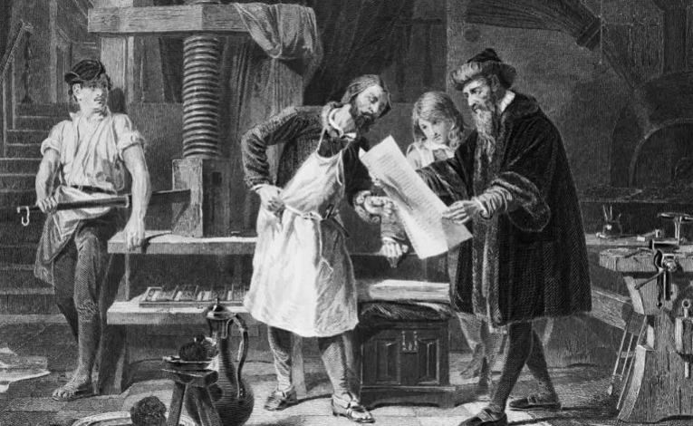 – الصورة: رسم توضيحي ليوهان غوتنبرغ وهو يعرض أول تجربة طباعة بآلته (غيتي)