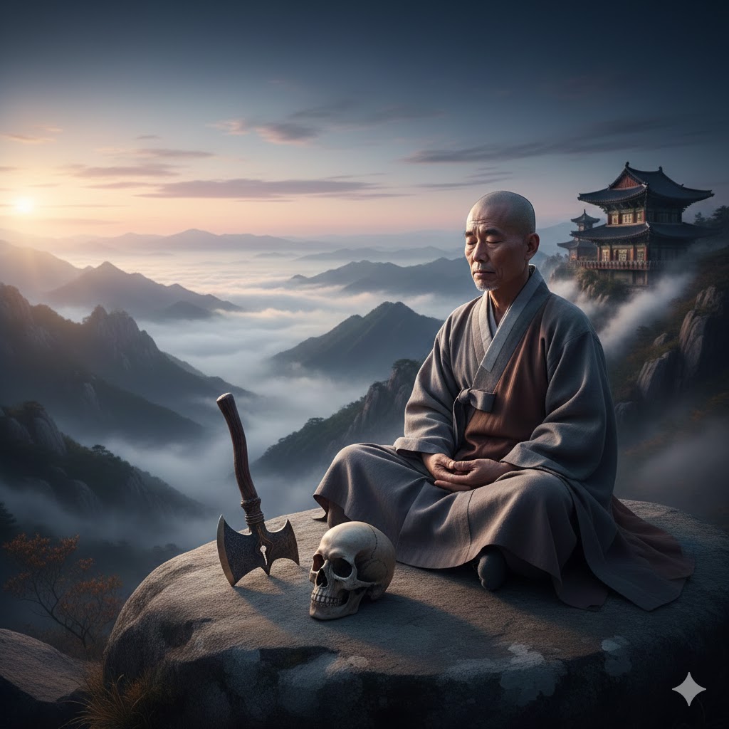 It would be that state of transcending language where I was disconnected from everyone, even from the wall that was myself, which I experienced when I hastily pursued Seon(equivalent to Chines Chan, Japanese Zen) practice as a monk in my twenties. At that time, while typhoons and floods swept even into the mountain valleys, the skull of a partisan was revealed, who must have died and been buried in mountain guerrilla warfare during the Korean peninsula’s civil war or the escalation period leading up to it. I picked up that skull, held a memorial service, placed it on my desk in my room, and concentrated on what is called ‘contemplation of dry bones’ practice. However, in any gap of my Seon practice, liberation from the self-image of ‘me’, that ego-attachment, was an impossible task. In despair, I searched and looked for a way to fill in one stroke the deep swamp between myself and others.