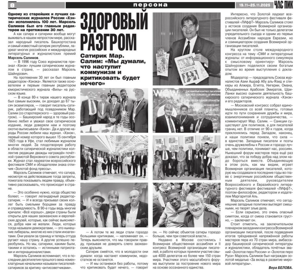 كان مارسيل سليمـوف رئيساً لتحرير مجلة «هانيك» لمدة 30 عاماً. إحدى أعرق وأفضل المجلات الساخرة في روسيا، «هانيك»، احتفلت بمرور 100 عام على تأسيسها. وكان مارسيل سليموف يشغل منصب رئيس تحريرها طوال ثلاثة عقود. وفي حديثه، يروي الكاتب الشعبي في باشكورتوستان، وأشهر ساخر في الجمهورية، والحائز العديد من الجوائز الأدبية والصحفية الروسية والدولية – مارسيل سليموف – كيف يمكن للسخرية والسّاخرين النجاة في عالمنا المعقد.