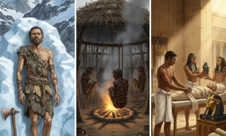 على نحو آخر، نجد في جنوب شرق آسيا بقايا مدخنة لممارسات تحنيطية ابتدائية. قبل نحو 10 آلاف إلى 12 ألف سنة، قام البشر القدماء بتجفيف جثث موتاهم عبر دخان نيران منخفض الحرارة وربط الأطراف في وضع القرفصاء. هذه الطريقة لم تمنحهم مجرد حفظ الجسد؛ بل كانت خطوة أولى في فهم كيفية إبطاء التحلل. الأحشاء لم تُنظف، الأنسجة لم تُحفظ بالكامل، ولم يكن هناك أي طقس ديني أو فلسفة تحكم هذه العملية. النتيجة كانت غالبًا هياكل عظمية تحمل آثار التجفيف والدخان، تعكس إدراك الإنسان القديم لقدرة الطبيعة على حفظ الجسد، لكنها تبقى تجربة بدائية مقارنة بما سيأتي لاحقًا في مصر.