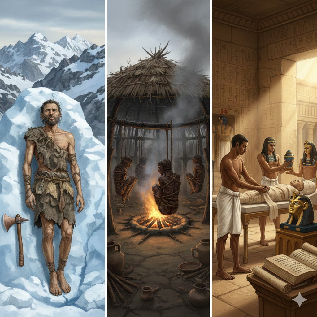على نحو آخر، نجد في جنوب شرق آسيا بقايا مدخنة لممارسات تحنيطية ابتدائية. قبل نحو 10 آلاف إلى 12 ألف سنة، قام البشر القدماء بتجفيف جثث موتاهم عبر دخان نيران منخفض الحرارة وربط الأطراف في وضع القرفصاء. هذه الطريقة لم تمنحهم مجرد حفظ الجسد؛ بل كانت خطوة أولى في فهم كيفية إبطاء التحلل. الأحشاء لم تُنظف، الأنسجة لم تُحفظ بالكامل، ولم يكن هناك أي طقس ديني أو فلسفة تحكم هذه العملية. النتيجة كانت غالبًا هياكل عظمية تحمل آثار التجفيف والدخان، تعكس إدراك الإنسان القديم لقدرة الطبيعة على حفظ الجسد، لكنها تبقى تجربة بدائية مقارنة بما سيأتي لاحقًا في مصر.