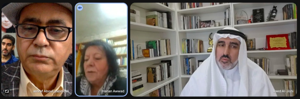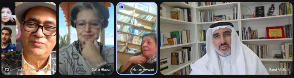 وبين القراءات، ناقش الضيوف قضايا الشعر والترجمة، وتبادلوا تجاربهم في الفضاءات الثقافية العالمية. عرض الشاعر السعودي رائد الجشي خبرته في تعريب الأدب العالمي، وقدّمت الشاعرة المغربية الإيطالية سردا يوجز رحلة صالونها الثقافي جنان آرجانة الممتد عبر ثلاث قارات منذ ربع قرن. قُرئت قصائد: لم؟، وعين غزة، ودثريني يا ساحات الأقصى، فيما قرأ المستضيف قصائد ومقاطع من باقي المختارات.