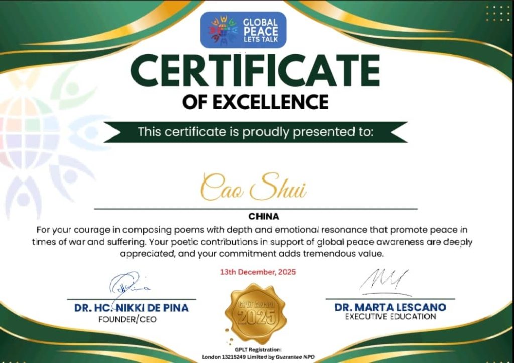 لندن، 13 ديسمبر — في لحظة نادرة من التلاقي الدولي بين الشعر والسلام، مُنِح الشاعر الصيني تشاو شوي لقب شاعر العام من قبل منظمة السلام العالمي البريطانية “لنتحدث” (GPLT) في لندن. ويُعد هذا التكريم، الذي لا يُمنح سوى لأربعة شعراء فقط على مستوى العالم، محطة بارزة في المسيرة الأدبية لتشاو شوي، كما يمثل أول جائزة كبرى ينالها في المملكة المتحدة.