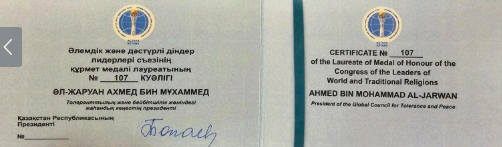 قلّد سعادة سفير جمهورية كازاخستان لدى دولة الإمارات العربية المتحدة، راوان جومابيك، معالي أحمد بن محمد الجروان، رئيس المجلس العالمي للتسامح والسلام، وسام الشرف الممنوح من فخامة الرئيس قاسم جومارت توكاييف، رئيس جمهورية كازاخستان، وذلك تقديراً لجهوده الدولية المتميزة في تعزيز قيم التسامح والسلام، ودعم الحوار بين الأديان والثقافات على المستوى العالمي.