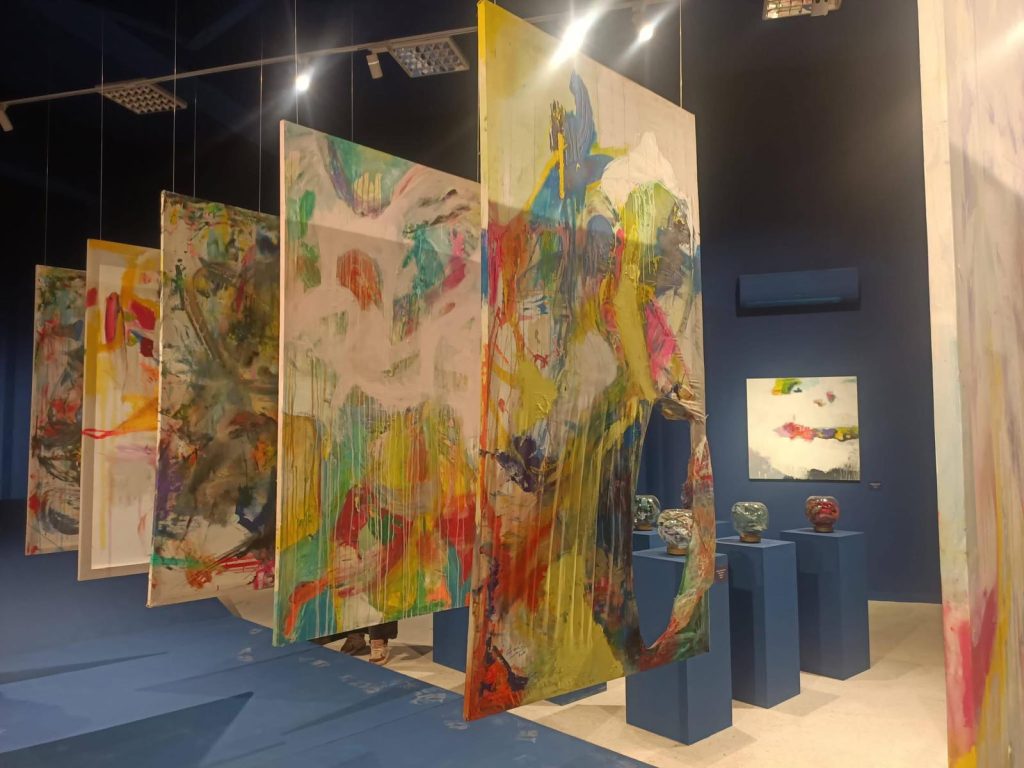 تعليق الأعمال بأحجامها الكبيرة في مشهد سينوغرافي إبداعي.