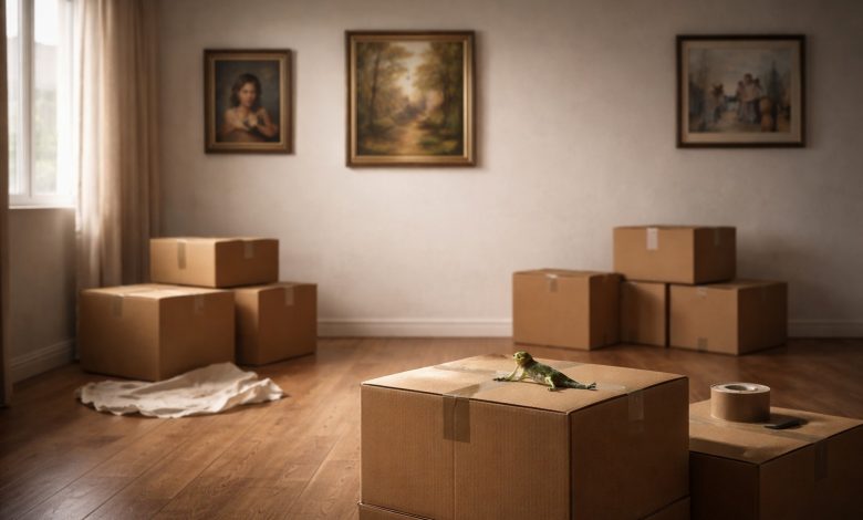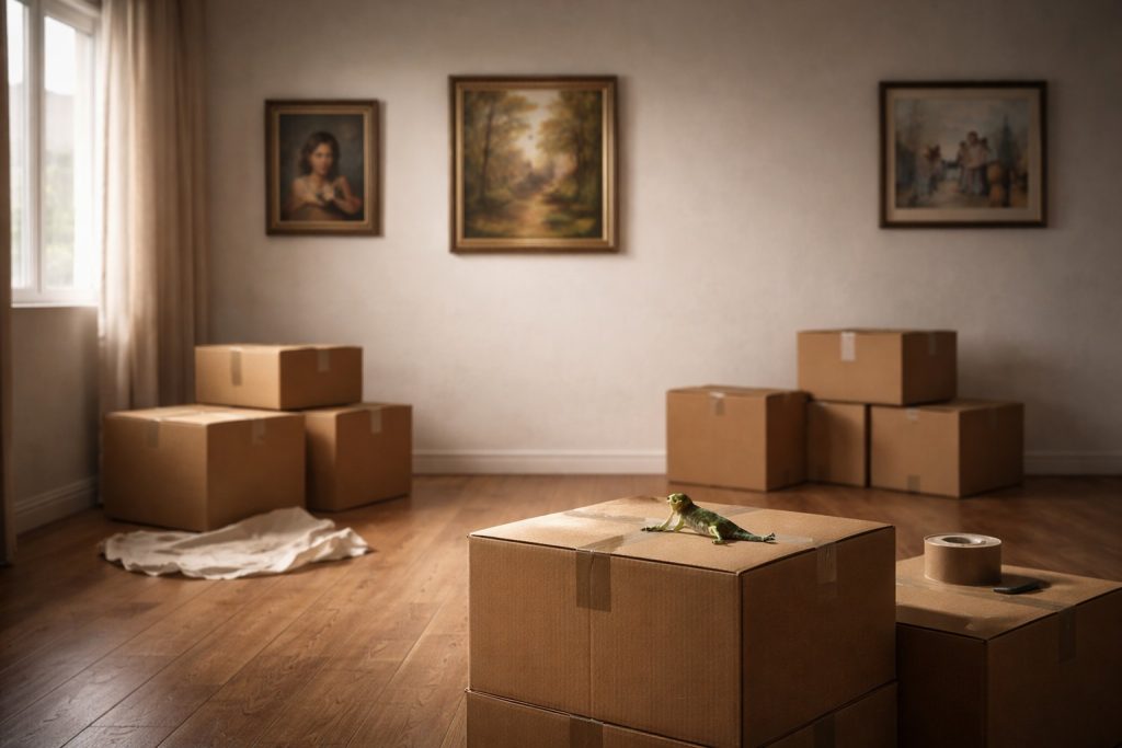 وهكذا يختفي عالمنا الشخصي — تلك الأشياء التي تُعرّفنا وتحكي شيئًا عن مرورنا على هذا الكوكب — ليحلّ محلّه فراغٌ عارٍ أو صناديق كرتونية محايدة، مغلقة بعناية، كأنّنا نعيش في مستودعٍ لذكريات الآخرين.