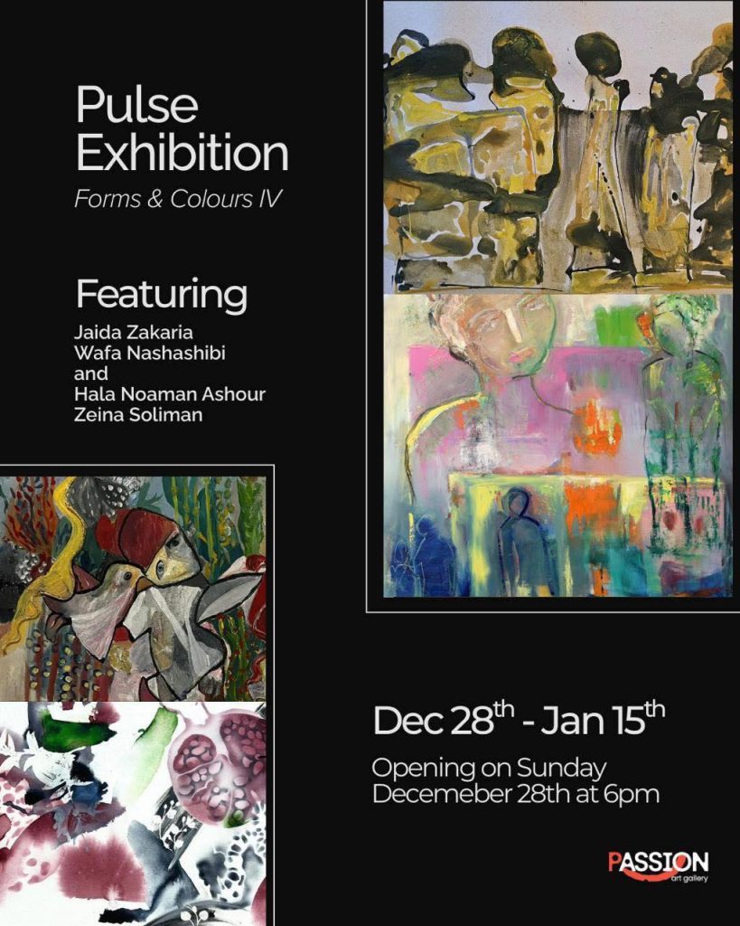 Passion Art Gallery is pleased to announce the opening of “Pulse” – Forms & Colours IV, a group exhibition that brings together four distinctive artistic voices: Jaida Y. Zakaria, Wafa Nashashibi, Hala Noaman Ashour, and Zeina Soliman. The exhibition opens on Sunday, December 28th, from 6:00 to 9:00 PM, at the gallery’s space in 23 Yehia Ibrahim Street, Zamalek, Cairo.