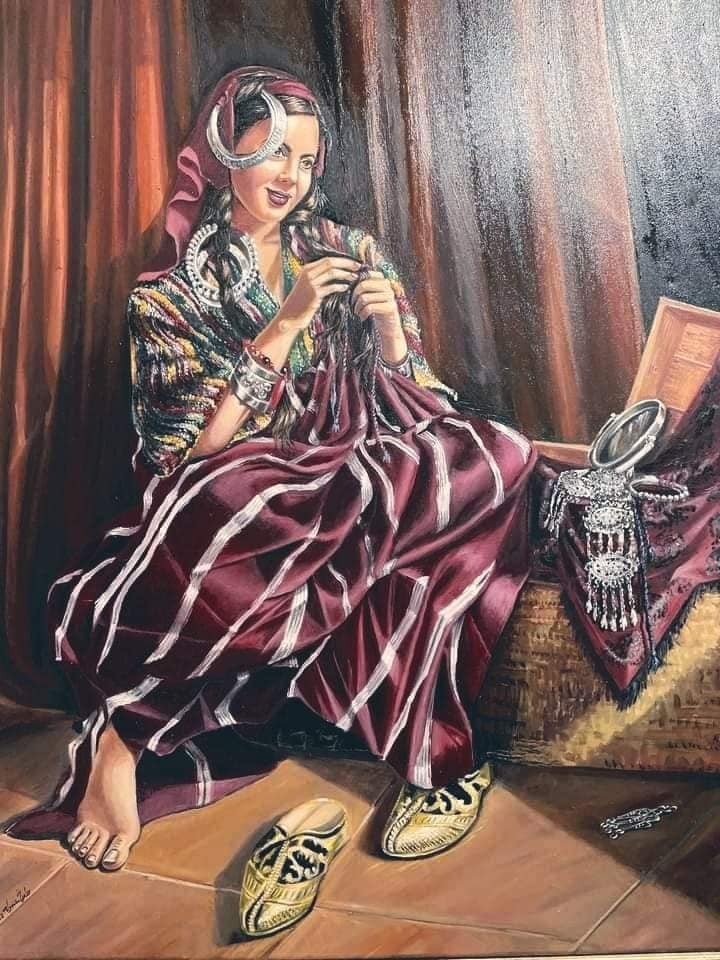 في اللوحة التي تصور المرأة الجالسة في فضاء داخلي ، يتحول المشهد إلى لحظة تأمل يومي ، حيث الفعل البسيط ، الإمساك بالخيط أو الحليّ ، يصبح فعلاً وجودياً . التكوين محكوم بإيقاع هادئ ، تنساب فيه الأقمشة الثقيلة بألوانها القانية ، وتتجاور الظلال والأنوار في انسجام يعكس خبرة لونية واعية . الأحمر الداكن والبني والذهبي لا تُستخدم لإبهار بصري سريع ، إنما لتكريس إحساس بالدفء والانتماء ، ولتأكيد العلاقة العضوية بين الإنسان ومحيطه الثقافي .