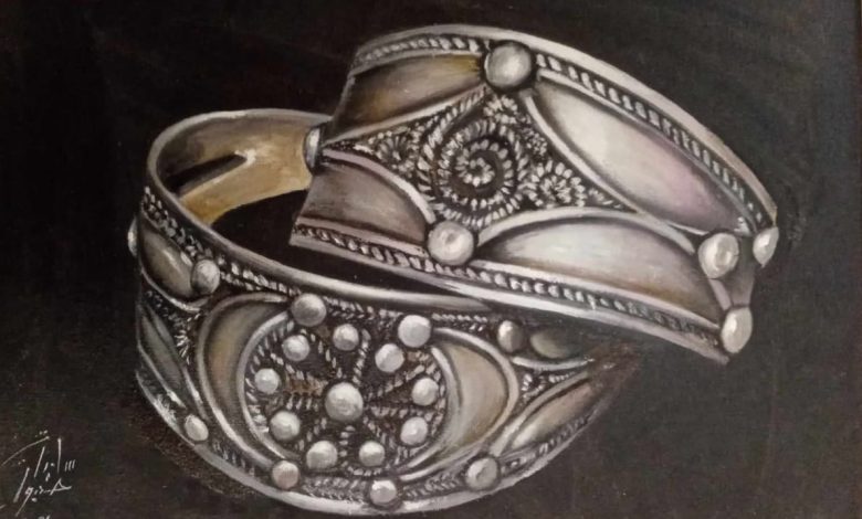 في لوحة الحلي الفضية ، لا نتعامل مع رسم لقطعة زينة ، وإنما مع قراءة تشكيلية لثقل الرمزية التي تحملها . فالفضة هنا ليست باردة ولا محايدة ، بل تتوهج بظلال رمادية دافئة ، وتتحول إلى سطح نابض بالحياة عبر تفاصيل دقيقة تحاكي أثر اللمس والزمن معاً . كما أن الخطوط المحفورة والنقاط البارزة تستحضر الطقس الاجتماعي الليبي المرتبط بالحليّ ، وتعيد الاعتبار لقيمتها كذاكرة جمعية أكثر من كونها مادة ثمينة . الضوء يتسلل بهدوء إلى التجاويف ، فيصنع توازناً بين الصلابة والرهافة ، بين الثبات والحركة ، وكأن القطعة تتنفس داخل العتمة .