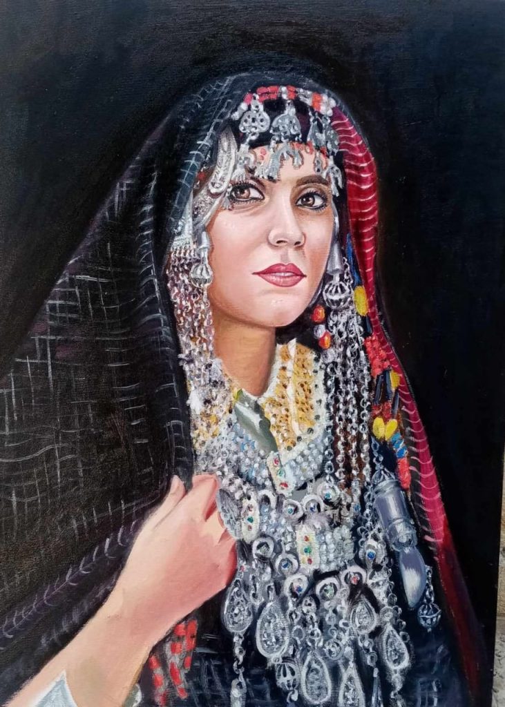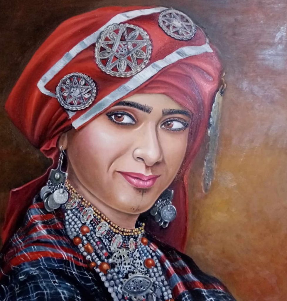 أما الوجوه النسائية في أعمالها ، فتبدو محاطة بالزيّ التقليدي كامتداد داخلي للذات . فالمرأة باللوحة لا ترتدي الموروث ، هي تسكنه ، ويَسكن ملامحها . العيون الهادئة ، النظرات العميقة ، والوقفة المتزنة تمنح الشخصية بعداً إنسانياً يتجاوز التمثيل الفولكلوري . واللون في هذه اللوحات يعمل على مستويين ، مستوى زخرفي غني بالتفاصيل المعدنية والخرز والأقمشة ، ومستوى شعوري أكثر خفوتاً في البشرة والخلفيات ، حيث تتراجع الصخب اللوني لصالح توازن بصري يتيح للروح أن تظهر .
