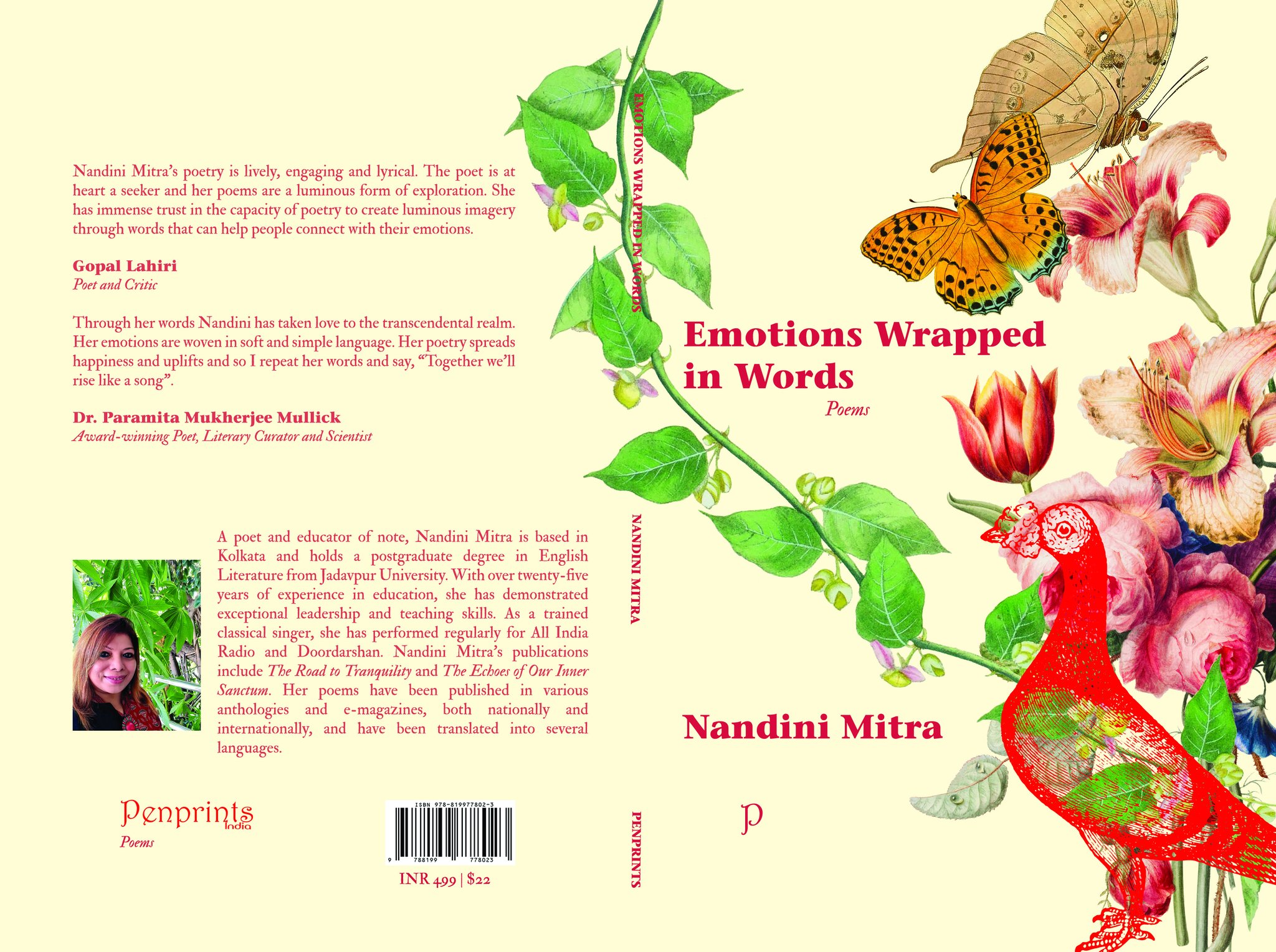Emotions Wrapped in Words by Nandini Mitra, a poetry collection praised for its luminous imagery and emotional depth (cover by Supriyo Chakraborty).