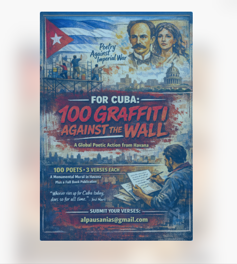 هافانا، كوبا — أعلن الشاعر والناشر والمنسّق الثقافي الكوبي البارز أليكس باوسيدِس عن إطلاق مبادرة شعرية دولية بعنوان «من أجل كوبا: 100 جرافيتي ضد الجدار»، داعيًا شعراء من مختلف أنحاء العالم إلى المشاركة في فعل فني جماعي دفاعًا عن كوبا وأمريكا اللاتينية في مواجهة الحرب الإمبريالية ومحو الهوية الثقافية.
