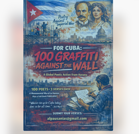 Havana, Cuba — Renowned Cuban poet, editor, and cultural organizer Alex Pausides has announced the launch of an international poetic initiative titled “For Cuba: 100 Graffiti Against the Wall,” calling on poets from around the world to participate in a collective artistic action in defense of Cuba and Latin America against imperial war and cultural erasure.