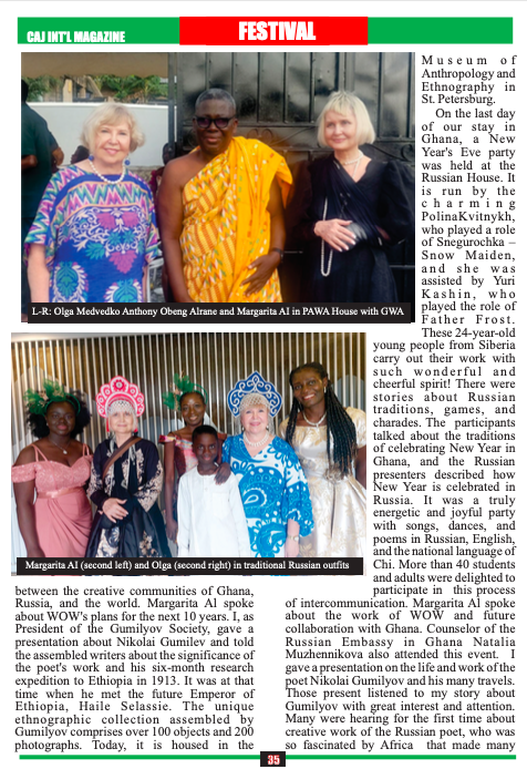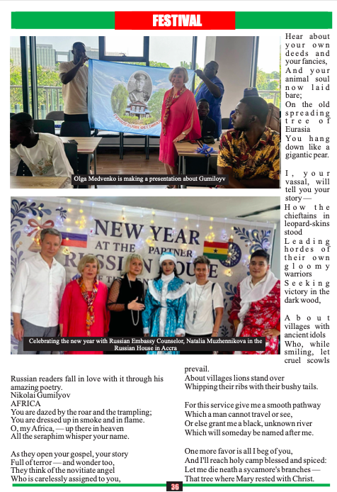 ثقافيًا وفنيًا، يحتفي العدد بالتجربة التشكيلية للفنانة الليبية سامية حنبولة، التي تعيد عبر أعمالها قراءة الزي التقليدي كلغة بصرية مشبعة بالذاكرة والزمن. كما يواكب مهرجانًا ثقافيًا في غانا أعاد اكتشاف الشاعر الروسي نيكولاي جوميليوف، بوصفه جسرًا ثقافيًا نادرًا بين أفريقيا وروسيا.