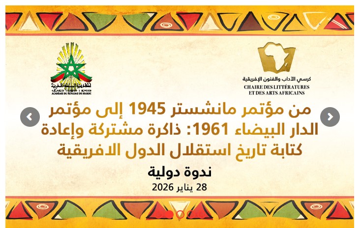 نظّم كرسي الآداب والفنون الإفريقية التابع لأكاديمية المملكة المغربية، بالشراكة مع رابطة الكتاب الأفارقة (PAWA)، ندوة دولية عنوانها:” من مؤتمر مانشستر 1945 إلى مؤتمر الدارالبيضاء 1961: ذاكرة مشتركة وإعادة كتابة تاريخ استقلال الدول الافريقية” وذلك يوم الأربعاء 28 يناير 2026 ابتداءً من الساعة التاسعة صباحا، استضافها المعهد الملكي للبحث في تاريخ المغرب، بمدينة العرفان بالرباط.