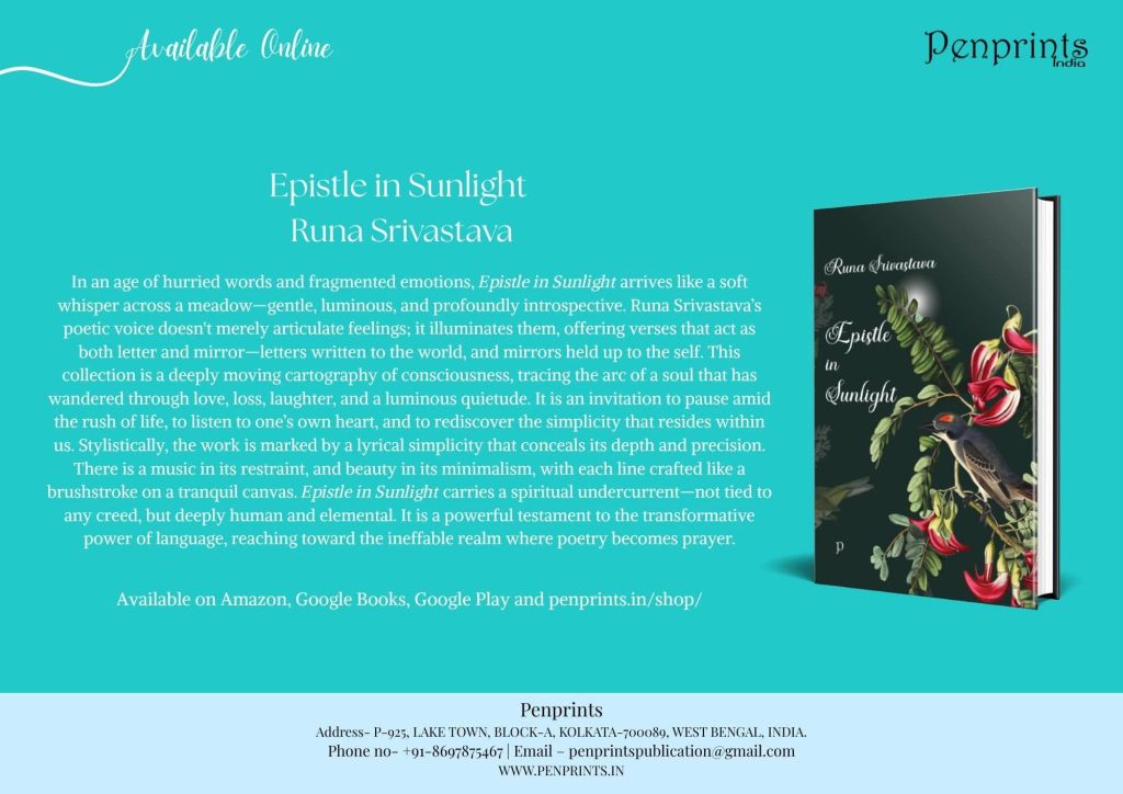 Epistle in Sunlight by Runa Srivastava was made available during the Kolkata Book Fair and continues to be available online via penprints.in/shop/, Amazon, Google Books, and Google Play.