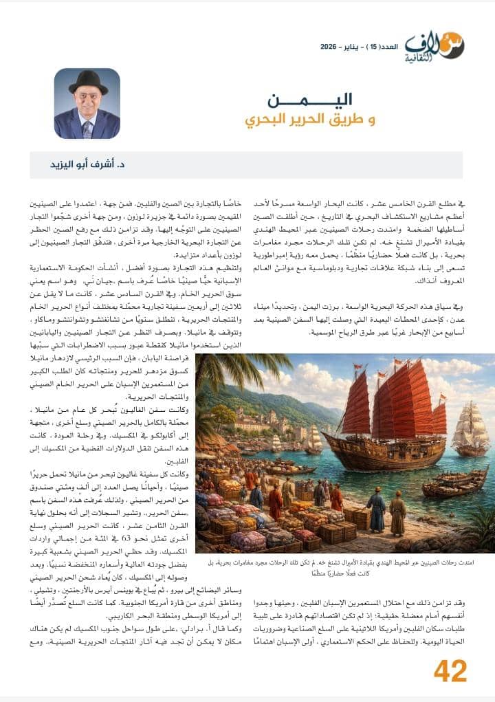 ويقدم مقال «اليمن وطريق الحرير البحري» للدكتور أشرف أبو اليزيد قراءة تاريخية معمقة لشبكات التجارة البحرية التي ربطت الصين بالعالم عبر المحيط الهندي والمحيط الهادئ، مبرزاً الدور المحوري للموانئ العربية، وفي مقدمتها عدن، ضمن هذه المنظومة العالمية المبكرة. يتتبع المقال صعود تجارة الحرير الصيني عبر الفلبين، خاصة جزيرة لوزون ومدينة مانيلا