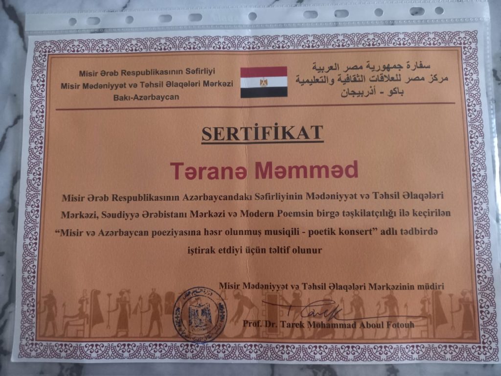 منحت سفارة جمهورية مصر العربية في باكو، أذربيجان، ممثلة في المركز المصري للعلاقات الثقافية والتعليمية، شهادة تقدير للأديبة المتميزة ترانة محمد، تقديرًا لمشاركتها المتميزة في الفعالية الثقافية البارزة التي أقيمت تحت عنوان “حفل موسيقي شعري مخصص للشعر المصري والأذربيجاني”.