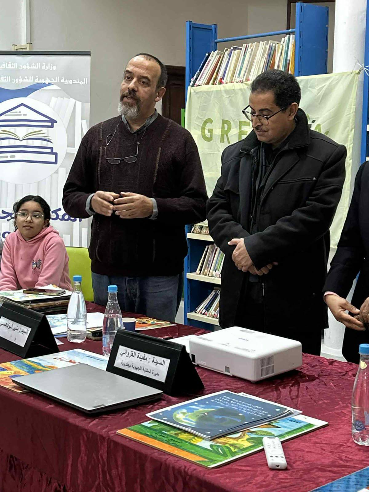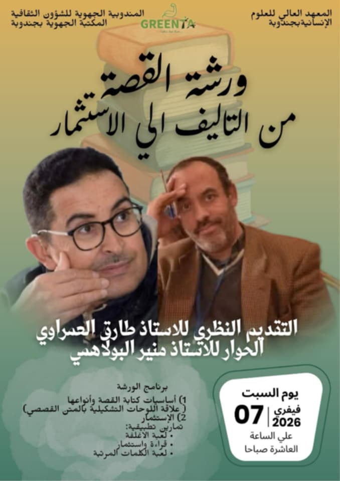 شهدت إحدى قاعات المكتبة الجهوية بمدينة جندوبة صبيحة 7فيفري 2026 فعاليات الورشة المشتركة بين المعهد العالي للعلوم الانسانية والمكتبة الجهوية والتي اختار لها المشرفان عنوان ” القصة من التأليف إلى الاستثمار“ والتي أمنها كل من الشاعر منير البولاهمي والكاتب طارق العمراوي وبعد الكلمات الترحيبية للسيدة مفيدة الغزواني مدير المكتبة وممثل نادي قرينتا GREENTA ورئيسه الطالب الصديق مهاب بقلوطي ليقدم بعد ذلك فقرات الورشة الشاعر منير البولاهمي لتنطلق مباشرة أشغال الفاعلية بكلمة مسجلة من طرف الكاتبة شيماء نبيل شاكرةاختيار قصتها ” زر السماء“ والفكرة من وراء كتابة قصتها وهي تساؤلات كريمتها العزيزة ثم كان التمرين التطبيقي الأول وهدفه استخراج مكونات القصة وخصائصها والهدف من كتابتها وبعد قراءة النتائج كان النقاش الذي أثرى التمرين بفتح الآفاق حول القصة ومعجمها اللغوي والعنوان والشخصيات والعبر والحكمة من كتابة القصة والرسائل وغيرها