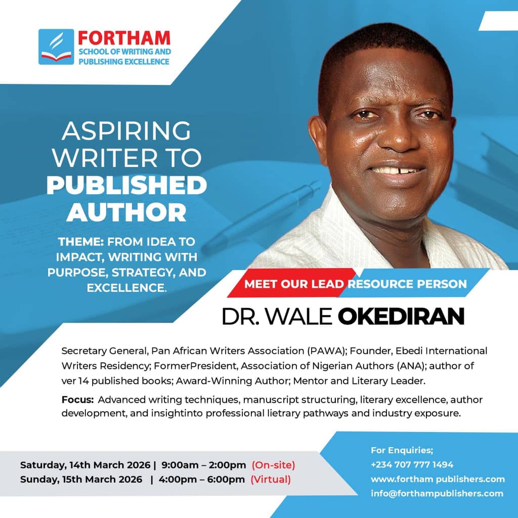 Fortham School of Writing and Publishing Excellence is set to host a transformative literary masterclass titled “Aspiring Writer to Published Author”, designed to equip emerging and developing writers with the tools, strategies, and professional insight needed to move from creative idea to published success.