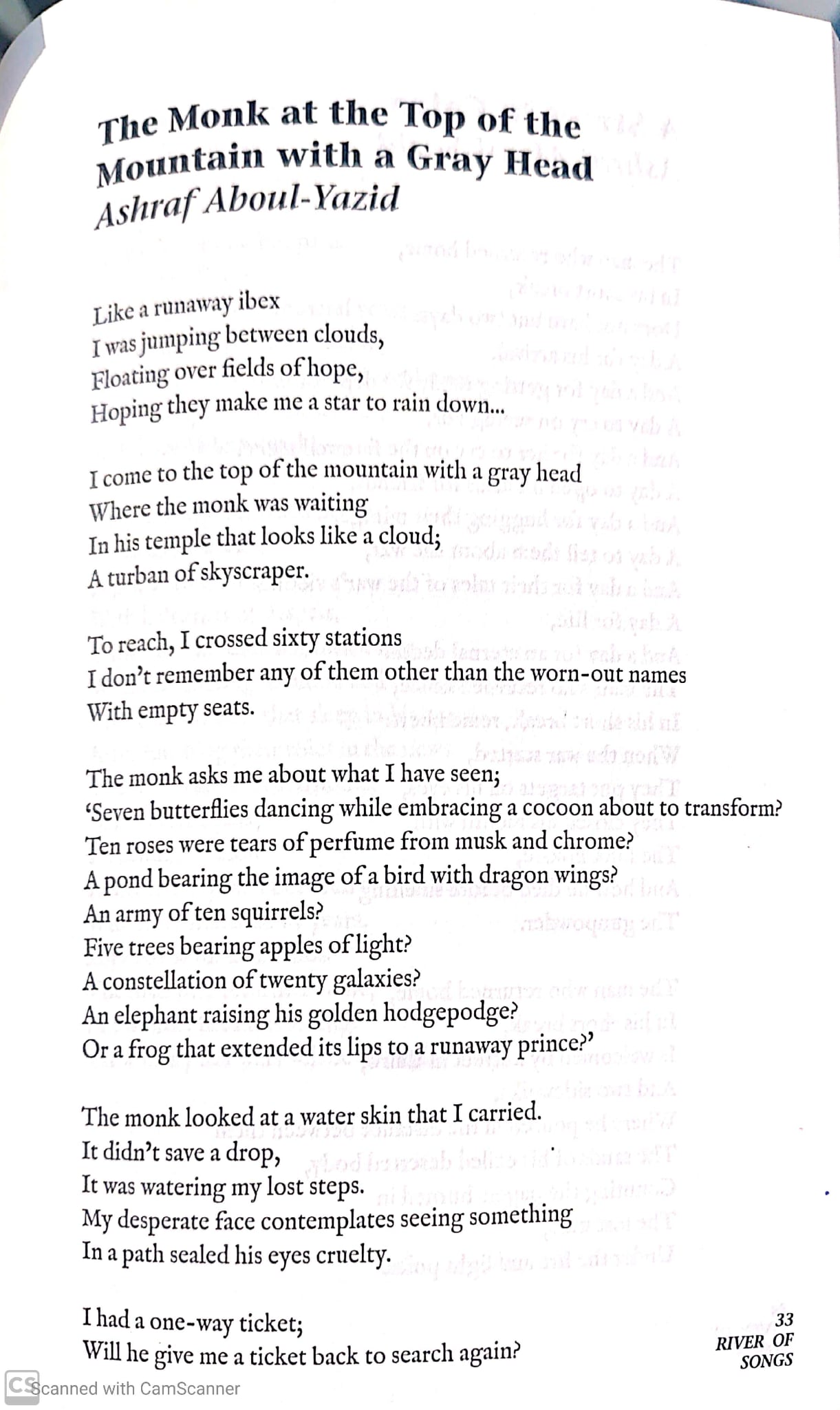 ومن الجدير بالذكر أن هذه المختارات تضم قصيدتين للشاعر المصري أشرف أبو اليزيد: (شارع في القاهرة و راهب رأس الجبل الأشيب() المنشورتين في الصفحات 29–31، مضيفة بعدًا دوليًا قويًا لهذا الاحتفال بالأصوات الشعرية من مختلف أنحاء الهند وخارجها.