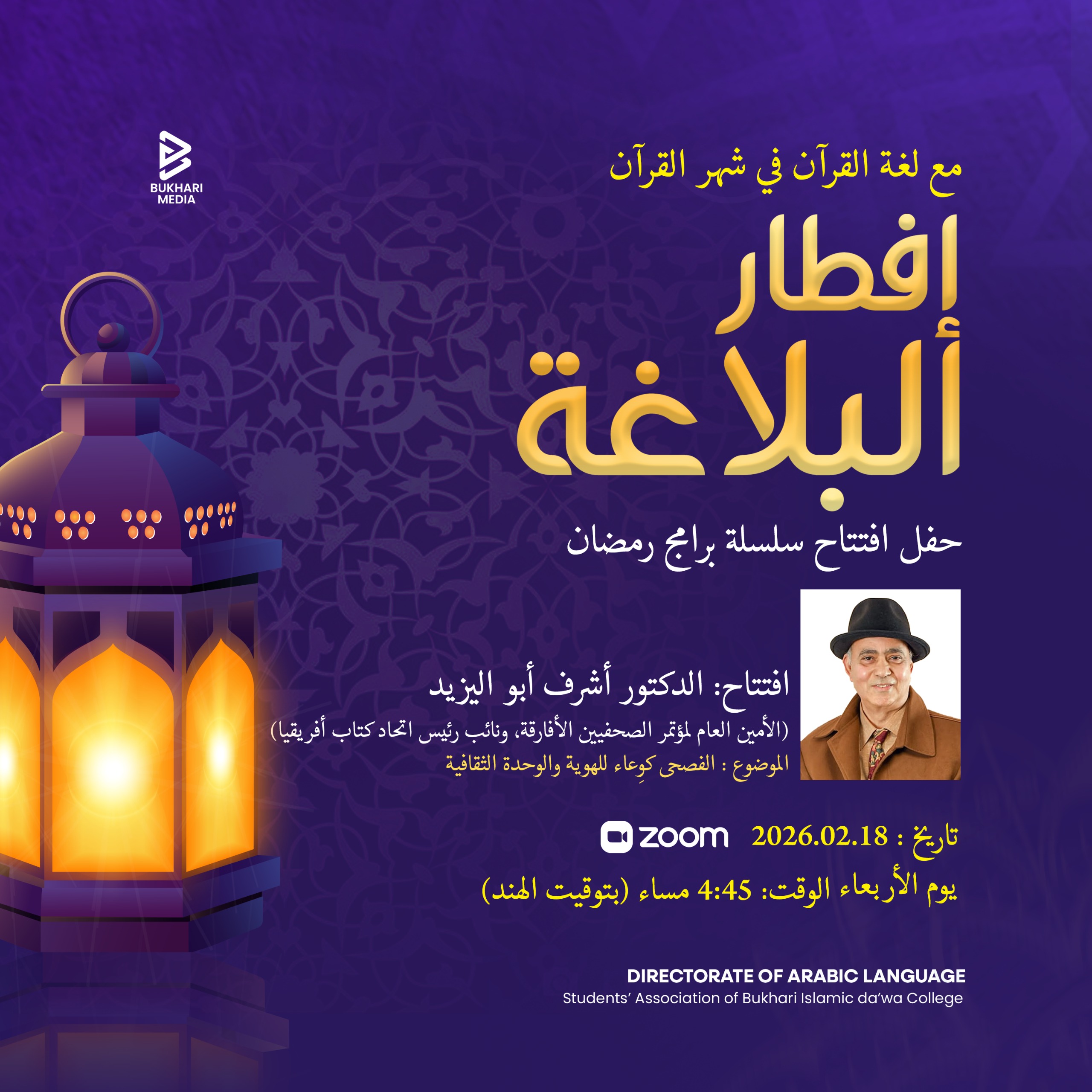 في خطوة مميزة لتعزيز الوعي الثقافي والأدبي بين طلاب كلية الإمام البخاري للدعوة الإسلامية، أعلنت منظمة الطلبة بالكلية عن افتتاح برنامجها الرمضاني الخاص بعنوان “إفطار البلاغة”، وذلك عبر منصة الإنترنت، يوم الأربعاء الموافق 18 فبراير 2026م، في تمام الساعة 4:45 مساءً بتوقيت الهند (1:15 مساءً بتوقيت مصر).