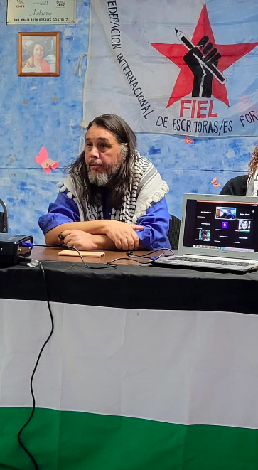 Accompanied by this photo. With this caption: Leonardo Herrmann giving a talk in solidarity with Palestine in Mexico City, November 2025. In the photograph, he is wearing the Kufiya that Hanan Awwad gave him