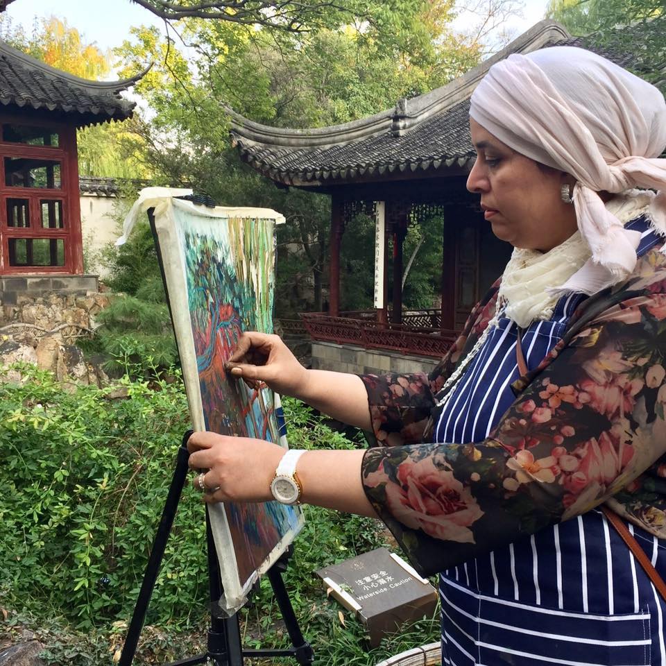Shafey’s accompanying text becomes essential to reading the painting. Her words speak of a quiet certainty—of a bird that trusts the temporality of clouds and the inevitable passing of storms.We need to know, understand and believe in this, in this certain times of wars. This metaphysical assurance is not illustrated literally but translated into visual tension. The bird’s body appears almost fractured, assembled from a mosaic of vivid reds, blues, ochres, and whites, as if it has endured the storm it philosophically transcends. Yet it does not collapse. Instead, it holds—precariously, beautifully—within a swirling blue expanse that suggests both sky and sea, both freedom and engulfment.
