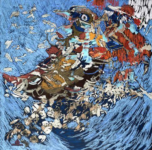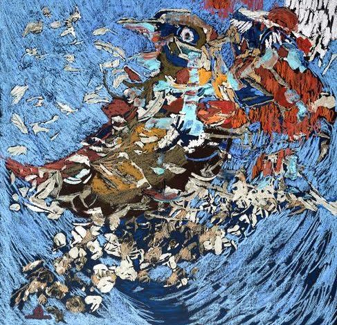 In Watching Birds (soft pastel and acrylic, 80 × 80), Egyptian Halla Shafey does not merely depict a bird; she reconstructs it from the scattered residues of motion, memory, and belief. The image resists stillness. It is a field of turbulence—shards of color, broken contours, and tactile strokes—yet from within this apparent dissonance emerges a form both fragile and assured: a bird suspended between disintegration and transcendence.
