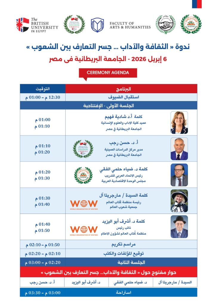 القاهرة – تحت رعاية الجامعة البريطانية في مصر، وبالتعاون مع كلية الآداب والعلوم الإنسانية، ومجلس الوحدة الاقتصادية العربية، ومجلس التعاون الثقافي العربي، تنطلق ظهر السادس من أبريل 2026 ندوة متميزة بعنوان **”الثقافة والآداب… جسر التعارف بين الشعوب”**، وذلك في رحاب الجامعة البريطانية بالقاهرة. تأتي هذه الندوة في إطار الجهود الرامية لتعزيز التفاهم بين الشعوب من خلال الثقافة والأدب والحوار الإنساني.