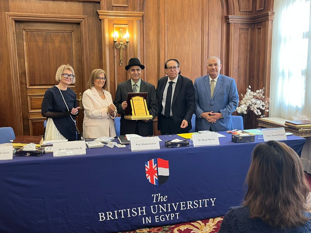 إنني في هذه المناسبةِ أتوجَّهُ بخالصِ التحيةِ والتقديرِ إلى الأستاذِ الدكتور محمد لطفي، رئيسِ الجامعةِ البريطانيةِ في مصر، على دعمهِ المتواصلِ للثقافةِ والفكرِ والإبداع، وإيمانهِ العميقِ بدورِ الجامعةِ كمؤسسةٍ حاضنةٍ للحوارِ الحضاريِّ وبناءِ الجسورِ بينَ الأمم. كما أحيّي مُضَيفتَنا الأستاذةَ الدكتورة شادية فهيم، عميدَ كليةِ الآدابِ والإنسانيات، على جهودِها الرائدةِ ومبادراتِها الثقافيةِ والأكاديميةِ والإنسانية، التي تُثري الحياةَ الفكريةَ وتفتحُ آفاقًا جديدةً للحوارِ والتلاقي.